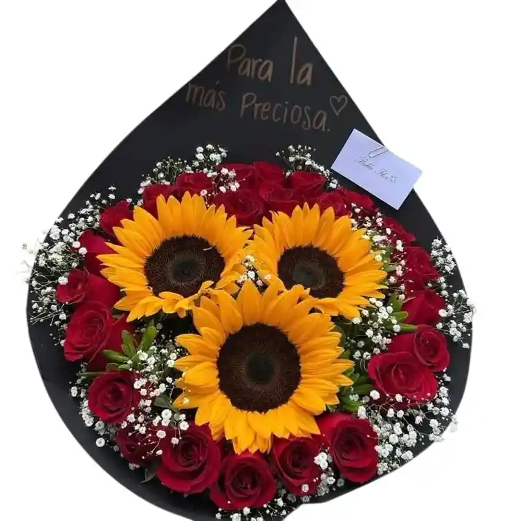 es una pieza de diseño floral vanguardista que combina la calidez del sol con la intensidad del romance. El arreglo se presenta en un exclusivo envoltorio de cono negro mate, que sirve como lienzo para un mensaje personalizado escrito a mano con caligrafía elegante.