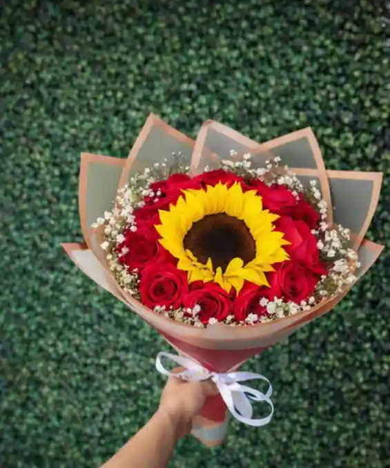 Impactante bouquet que combina la intensidad de las rosas con la energía del girasol. Un detalle vibrante que expresa amor, alegría y pasión. 🌻🌹✨