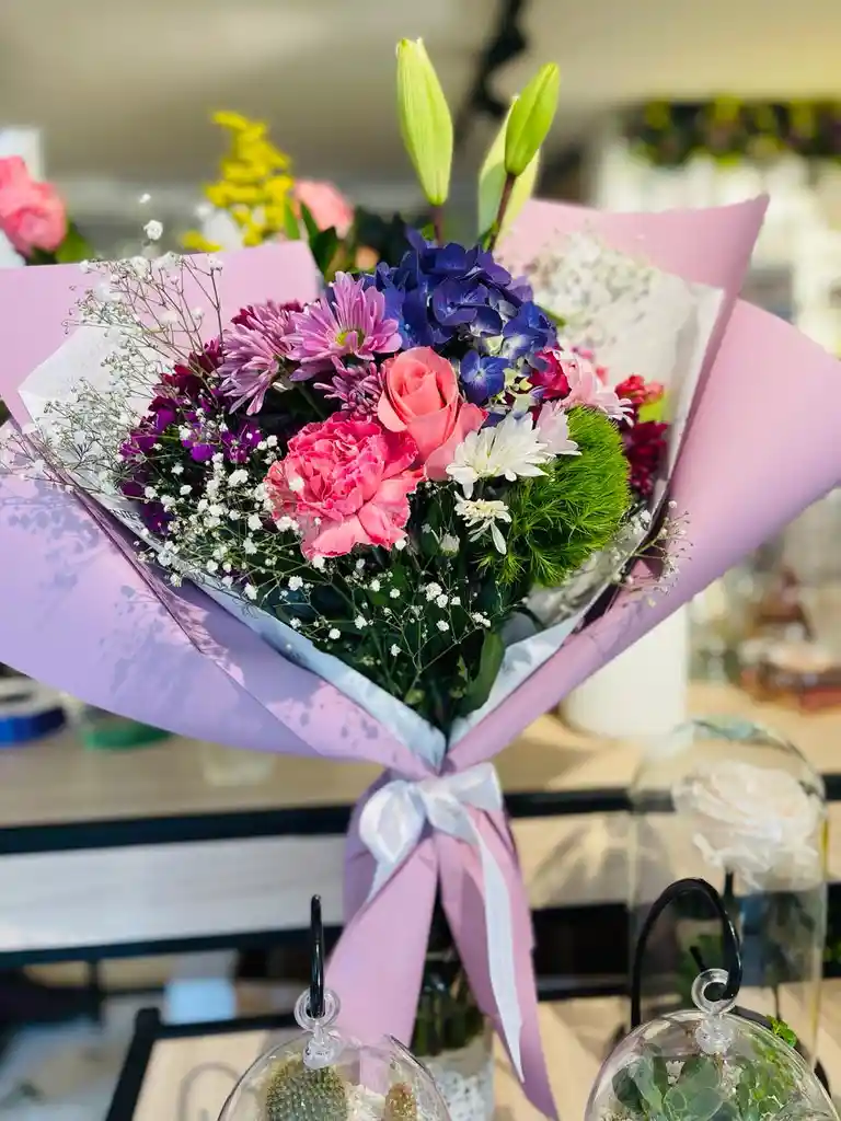 Sorprende con este magnifico regalo Contiene hortensias, astromelias, rosas lirios, claveles, margaritas, gypsofilia y pompon