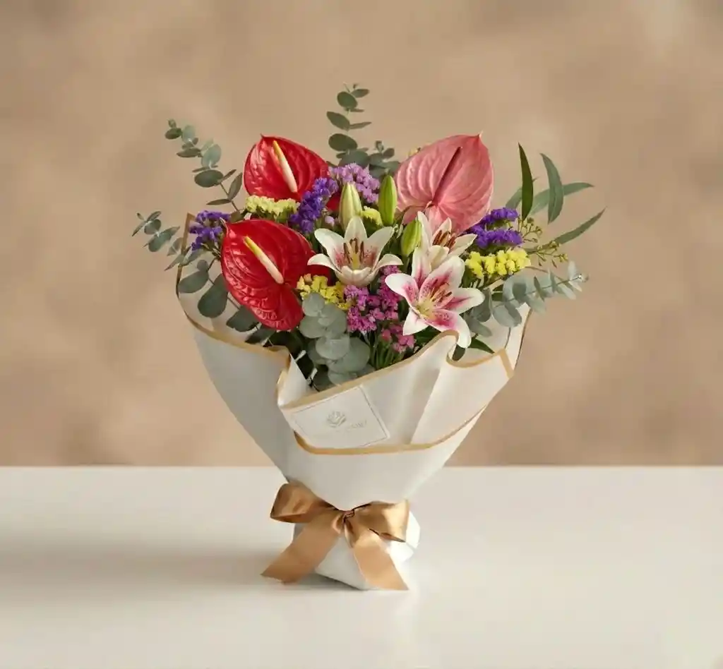 Bouquet de Lirios y Anturios en Bogotá – Fruit Santé Exótico, elegante y memorable. Nuestro bouquet premium de lirios rosados, anturios rojos, flores mixtas y eucalipto combina texturas modernas en una paleta vibrante. Presentación minimalista en papel blanco con ribete dorado y lazo de satín. Entrega el mismo día en Bogotá (pedidos antes de 5:00 p.m.). ¿Para quién y para qué momento es ideal? Aniversarios y fechas especiales: un gesto con carácter que destaca. Felicitaciones y logros: ascensos, graduaciones, aperturas. Agradecimiento sofisticado: para alguien que te abrió puertas. Regalos corporativos: recepción, bienvenida de clientes, reconocimientos internos. Reconciliación con intención: un detalle que comunica cuidado y decisión. Decoración puntual: centros de mesa o recibidores que necesitan presencia. Detalles del bouquet Composición sugerida: lirios rosados, anturios rojos/rosa, statice morado, solidago amarillo y eucalipto silver dollar. Estilo: minimalista premium con foco en contraste y textura. Presentación: papel blanco premium con filo dorado y lazo de satín Fruit Santé. Incluye: tarjeta para mensaje personalizado. Nota: las variedades pueden ajustar levemente según temporada, manteniendo el estilo y la paleta.