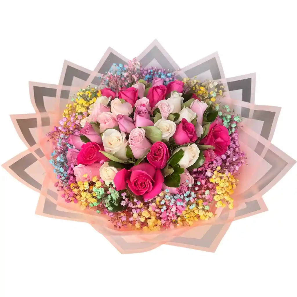 Arreglo floral x 50 rosas tipo exportación tonalidades pastel (Fucsia, Blanco, Rosado, Lila) Follaje fino brillantina, gipsófilia de colores Papel coreano tonos claros Moño en satín fucsia