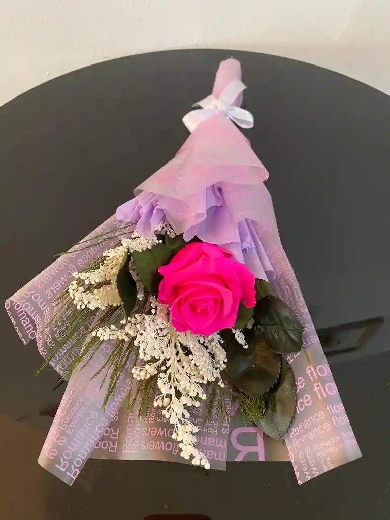 Para una persona muy afortunada y especial! Este arreglo floral en estilo Bouquet es diseñado con una hermosa Rosa Medium y follajes preservados: Naturales que se someten a un proceso para que perduren por más de 1 año, no son artificiales. Observación: Te puede llegar cualquier color de rosa disponible, tales como: Fucsia, Roja o Blanca. Incluye: Tarjeta o carta con el mensaje que desee. Instrucciones de cuidado para los arreglos preservados.