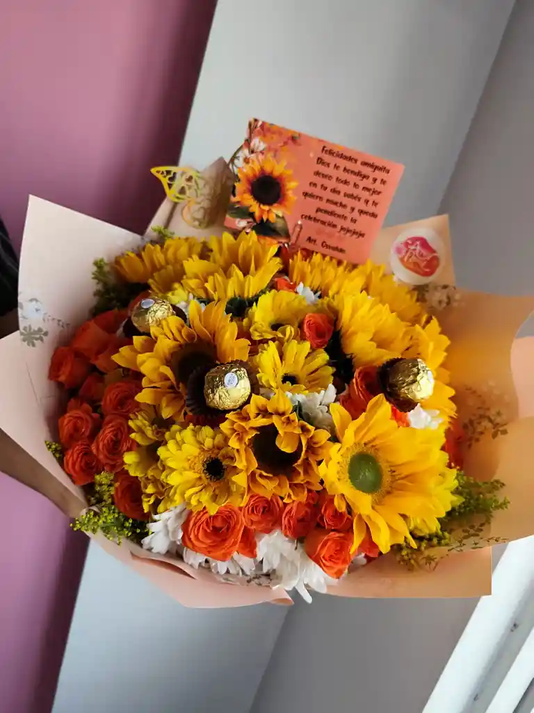 Un radiante y encantador bouquet compuesto por una armoniosa combinación de cuatro variedades de flores frescas: girasoles, gerberas, rosas y margaritas. Este arreglo se complementa con finos toques de follaje y detalles decorativos, creando un contraste vibrante y lleno de vida. Presentado en una elegante envoltura de papel coreano, su diseño sofisticado incluye también un toque dulce con chocolates Ferrero Rocher, añadiendo un detalle especial. Incluye: *Tarjeta personalizada con dedicatoria *Decoración especial del bouquet *Recomendaciones para el cuidado de las flores *Sobrecito de alimento floral para prolongar su frescura El detalle perfecto para expresar amor, gratitud o celebrar una ocasión especial con estilo y elegancia. Los tonos pueden variar según disponibilidad, manteniendo siempre la calidad y belleza que caracteriza cada uno de nuestros arreglos. Nota importante: Por favor, deja el mensaje de dedicatoria y cualquier indicación adicional en el chat de la aplicación al momento de hacer tu pedido. Esto nos ayudará a personalizar tu arreglo con el mayor cuidado posible.