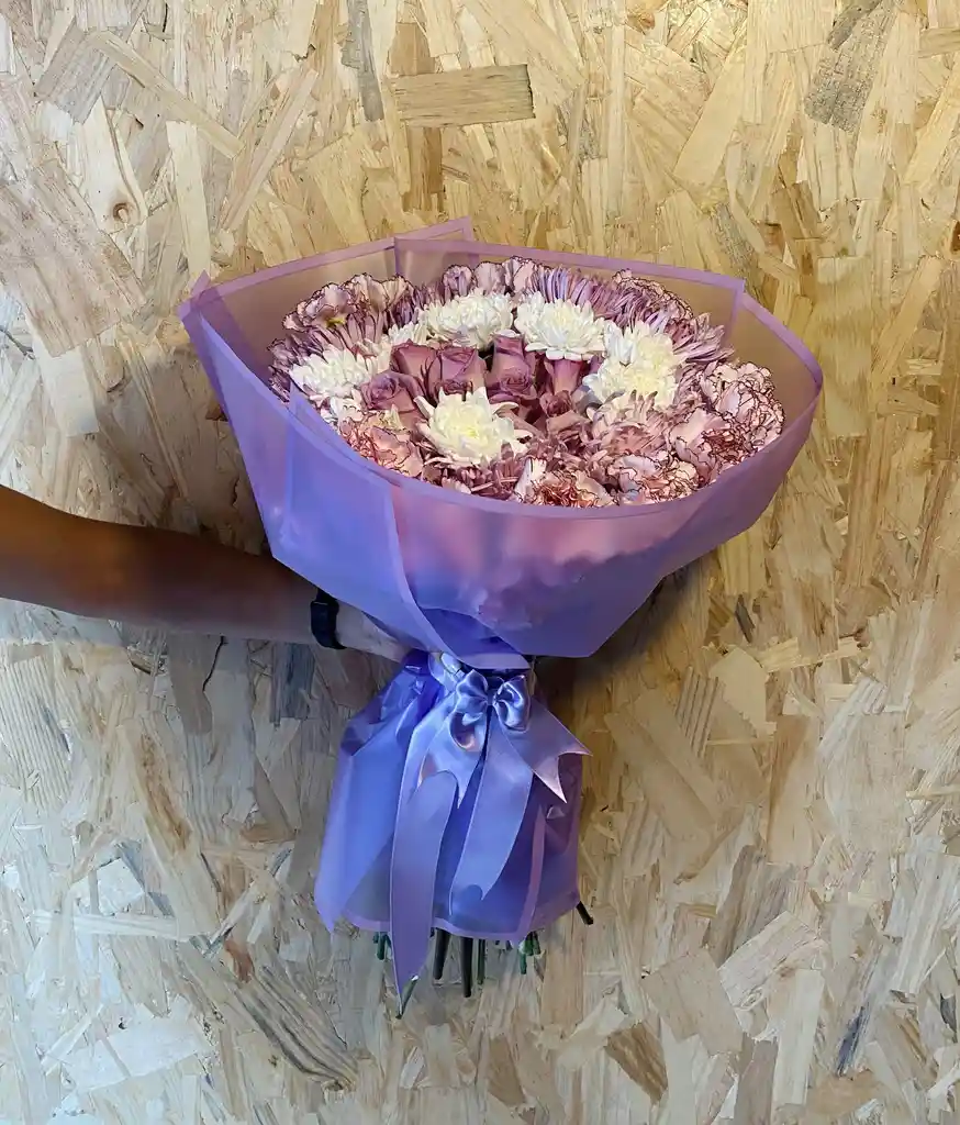 hermoso bouquet realizando con diferentes tipos de flores en colores pastel envuelto en un papel impermeable acorde a su color