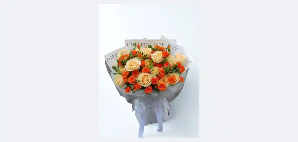 Bouquet de 12 rosa blanca y rosa mini naranja Nota: La flor puede ser sustituida dependiendo la disponibilidad de color y del producto “Mensaje Personalizado” máximo de 30 caracteres (Dejar el mensaje en el chat, los comentarios no se previsualizan para la tienda por lo que si se dejan allí no podrá ser incluido).