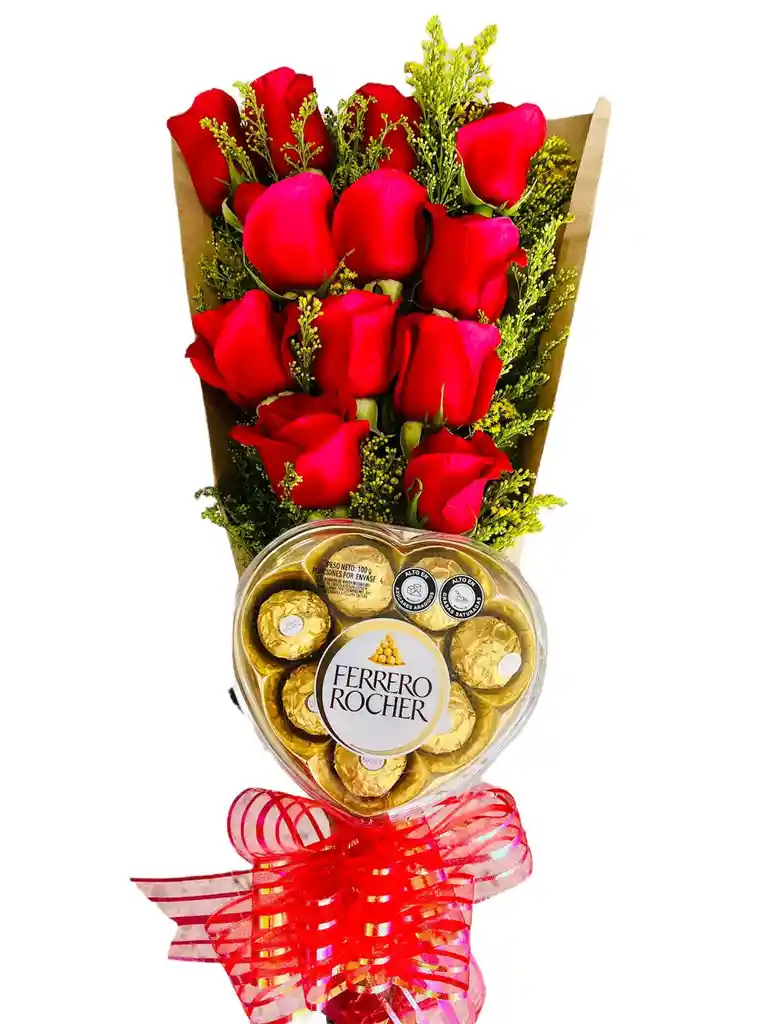Arreglo floral x12 rosas tipo exportación en tonalidad rojo Chocolates ferrero rocher corazón x8 unidades Follaje fino solídago Papel craft Moño en satín rojo