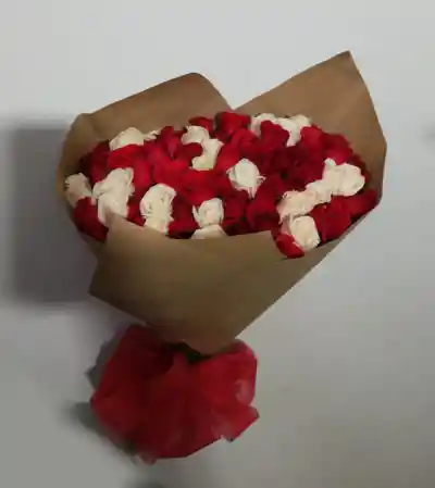 Es un bouquet elaborado con 72 rosas rodeado con papel craft acompañado de follaje y un moño
