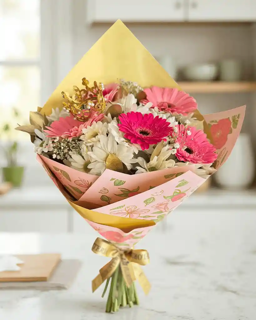 -Bouquet con 6 Gerberas en tonos pasteles -Hortensias -Follaje Verde -Empaque en papel decorativo -Moño en cinta de Tela -Tarjeta de Mensaje -Corona de Princesa de plastico