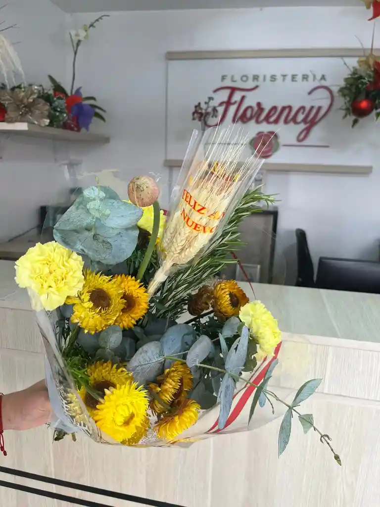 BOUQUET PROPERIDAD AJO, RUDA, BOTON ORO, ROMERO, ESPIGA, FLOR AMARILLA.