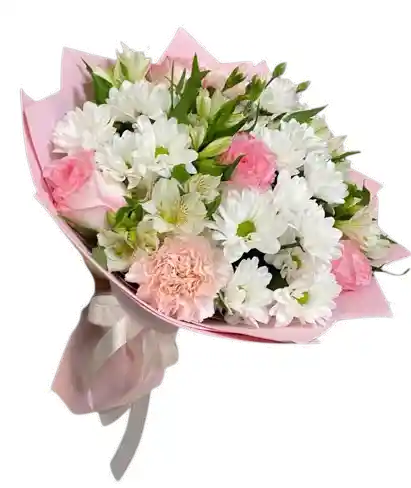 Un delicado bouquet compuesto por margaritas blancas, rosas rosadas, alstroemerias y un toque de clavel pastel, creando una mezcla suave y armoniosa. Su combinación de tonos blancos y rosados transmite frescura, ternura y elegancia natural. Envuelto en papel rosa claro con un lazo satinado marfil, ofrece un acabado romántico y moderno. Ideal para cumpleaños, agradecimientos, nacimientos o para regalar un detalle lleno de luz y cariño. Su estilo suave y equilibrado lo convierte en un arreglo perfecto para iluminar cualquier momento especial.