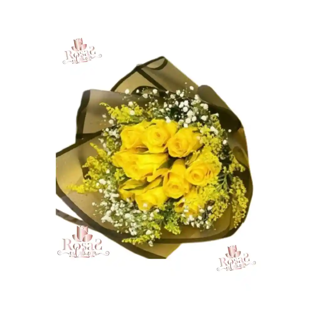 Bouquet de 12 rosas amarillas frescas, rodeadas de delicado follaje y envueltas en elegante papel semitransparente con bordes negros que realzan su contraste y belleza. Perfecto para transmitir alegría, energía y gratitud en cualquier ocasión especial. Incluye tu mensaje personalizado en el área de observaciones o escríbenos por WhatsApp al 3172528979 para hacerlo aún más significativo.