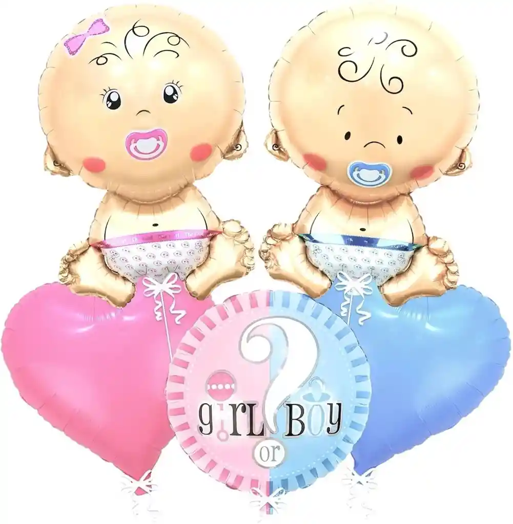 Bouquet Metalizado revelacion de Genero Niño O Niña 5 piezas,contiene 1 glbobo metalizado corazon azul 18", 1 globo metalizado corazon oro rosa 18", 2 Globo bebe metalizado Niño Niña inflable 27", El producto se envia desinflado