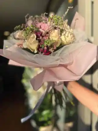Bouquet "Rosa" . Este cautivador arreglo combina rosas, bocas de dragón y follaje en tonos rosados, blancos y un toque de morado, creando una sinfonía de colores elegantes y frescos. Cada elemento ha sido cuidadosamente seleccionado para ofrecer la máxima calidad y belleza. Perfecto para expresar sentimientos profundos en ocasiones especiales o para iluminar cualquier espacio con un toque de sofisticación. Experimenta la excelencia floral con nuestro "Praga" y eleva tus momentos especiales con la frescura y el encanto que solo nuestra plataforma puede ofrecer.