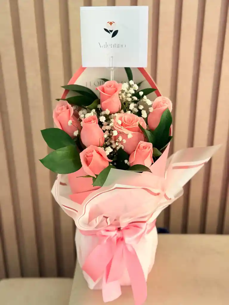 Bouquet de 6 rosas, perlita y follaje decorativo.