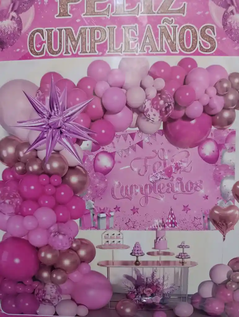 Transforma cualquier celebración en un escenario de ensueño con Pink Glam Birthday Luxe, una decoración de cumpleaños elegante y sofisticada en tonos rosados, blush y dorado. Incluye arco de globos orgánico, estrella metálica central, mesa principal decorada y fondo temático con mensaje de cumpleaños.