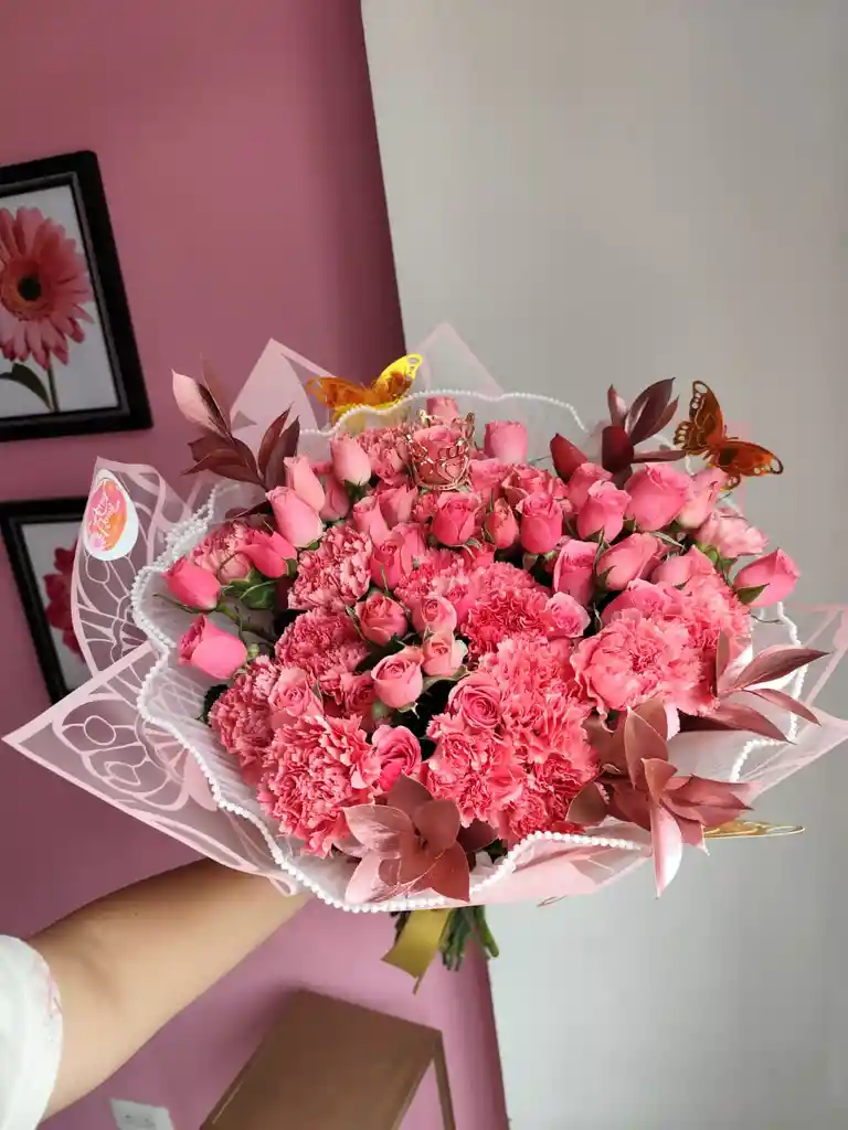 Un bouquet dulce y armonioso, elaborado con delicadas rosas spray rosa y claveles en suaves tonos rosados, realzados con follaje fresco que aporta textura y movimiento. Esta combinación transmite ternura, gratitud y cariño sincero, ideal para expresar emociones afectuosas con un toque de romanticismo sutil y elegancia delicada. Incluye: *Tarjeta personalizada con dedicatoria *Decoración especial del bouquet *Recomendaciones para el cuidado de las flores *Sobrecito de alimento floral para prolongar su frescura El detalle perfecto para expresar amor, gratitud o celebrar una ocasión especial con estilo y elegancia. Los tonos pueden variar según disponibilidad, manteniendo siempre la calidad y belleza que caracteriza cada uno de nuestros arreglos. Nota importante: Por favor, deja el mensaje de dedicatoria y cualquier indicación adicional en el chat de la aplicación al momento de hacer tu pedido. Esto nos ayudará a personalizar tu arreglo con el mayor cuidado posible.