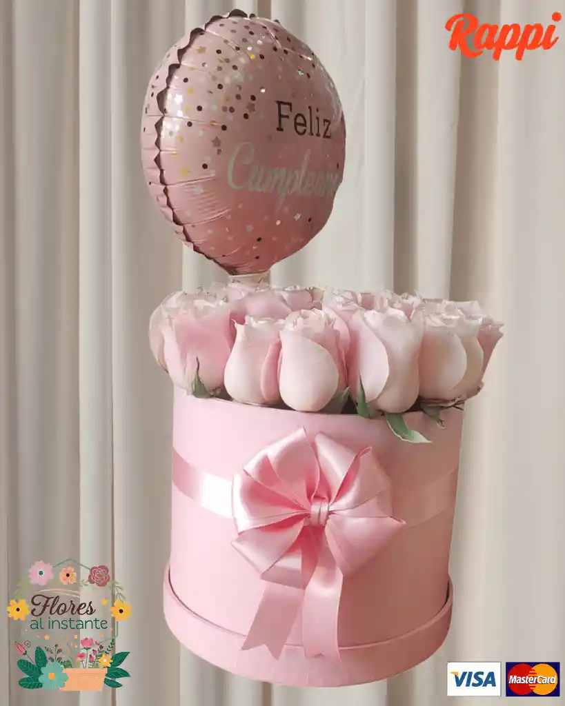 El regalo perfecto para hacerla sentir especial. Este elegante y voluminoso bouquet viene en una caja decorativa redonda. Contiene 24 hermosas rosas rosadas, un globo metalizado y un mensaje o frase personalizada, haciendo de este un detalle inolvidable para tu ocasión especial.
