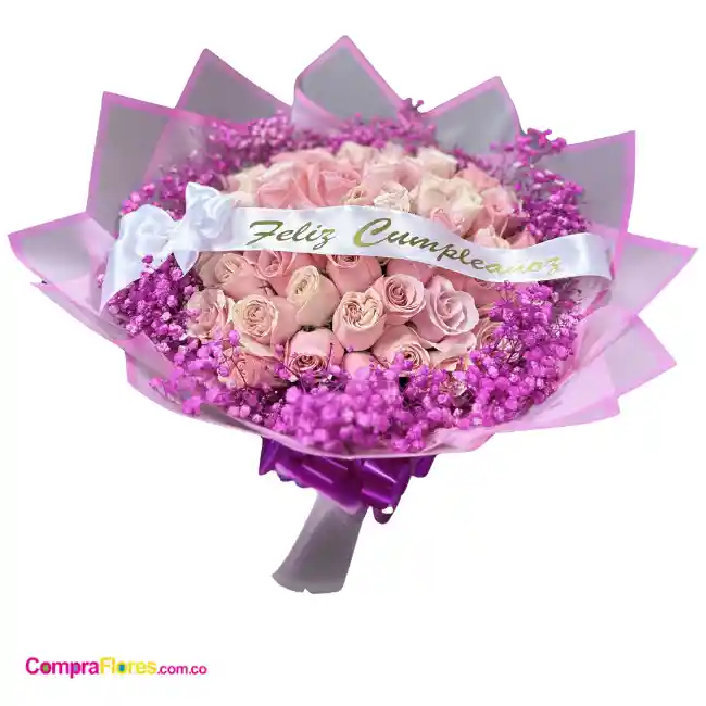 Hermoso Bouquet de 50 rosas con perlita color fucsia y cinta personalizada feliz cumpleaños