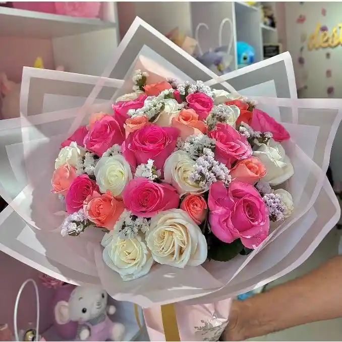 Bouquet de 24 rosas naturales con papel decorativo, moño y tarjeta. Es un perfecto detalle para regalar en fechas especiales, decora espacios y brinda elegancia. Su duración es de aproximadamente 10 días. El color de las rosas y el papel decorativo varían de acuerdo a la disponibilidad en tienda.