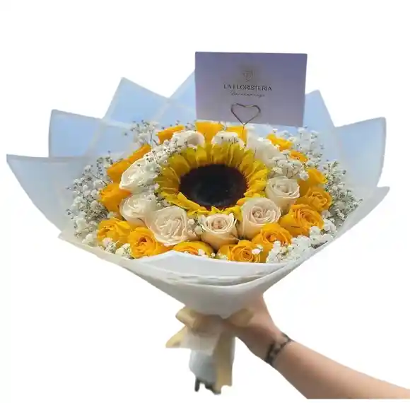 BOUQUET DE ROSAS AMARILLAS Y BLANCAS, DECORADO EN PAPEL COREANO, MOÑO Y TARJETA PERSONALIZADA