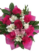 Bouquet de 6 rosas fucsias con 1 paquete mix de astromelia blanca y rosada y 6 varas de rusco . Nota: La flor puede ser sustituida dependiendo la disponibilidad de color y del producto “Mensaje Personalizado” máximo de 30 caracteres (Dejar el mensaje en el chat, los comentarios no se previsualizan para la tienda por lo que si se dejan allí no podrá ser incluido).