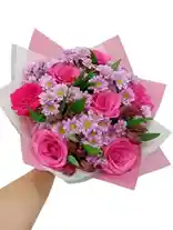 Bouquet de 6 rosas fuccias con 1 paquete de astromelia roja y 6 varas de margarita morada. Nota: La flor puede ser sustituida dependiendo la disponibilidad de color y del producto “Mensaje Personalizado” máximo de 30 caracteres (Dejar el mensaje en el chat, los comentarios no se previsualizan para la tienda por lo que si se dejan allí no podrá ser incluido).
