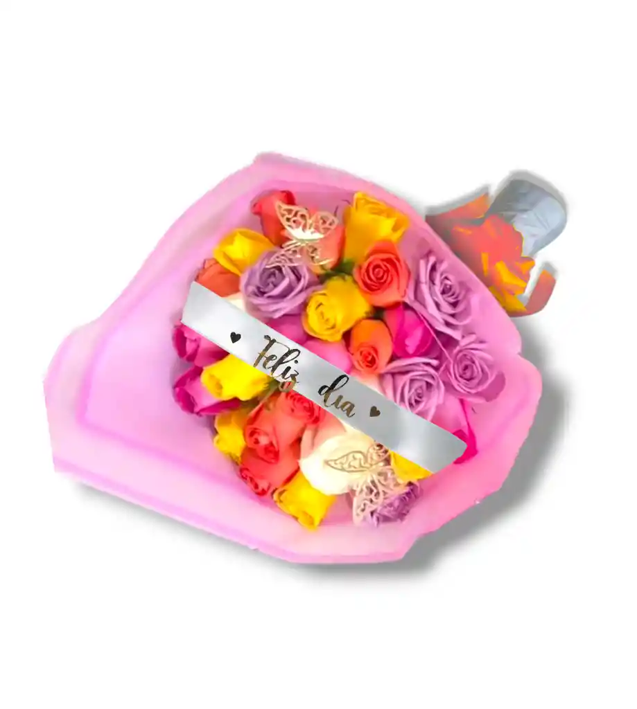 Bouquet de 24 rosas de colores , cinta frase feliz día.
