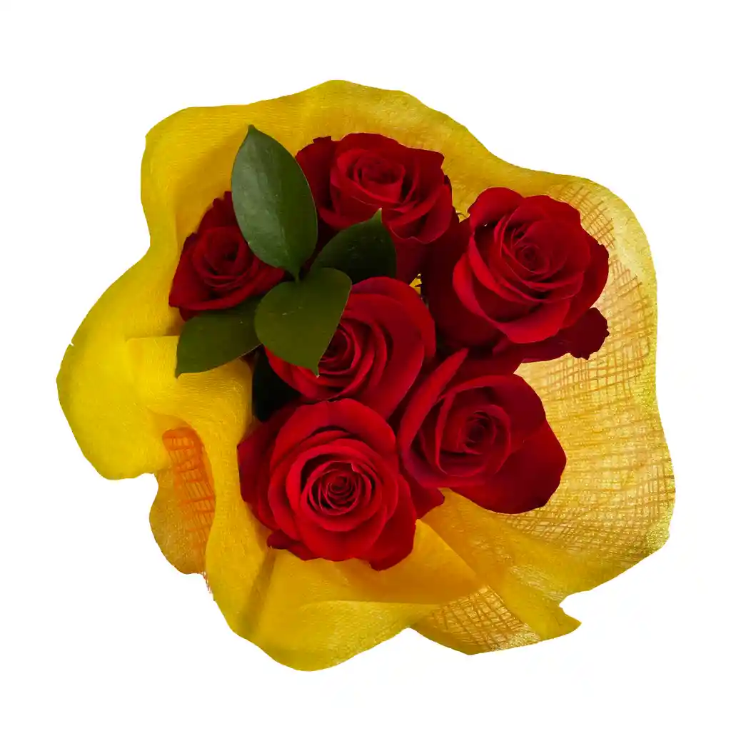 Ramo de 6 rosas de exportación color rojo de 50-60 cm de largo + 1 verde. Follaje. Alimento para flores y tarjeta. Este ramo viene en espiral para colocar inmediatamente en florero. Sí deseas poner un mensaje déjalo en comentarios.
