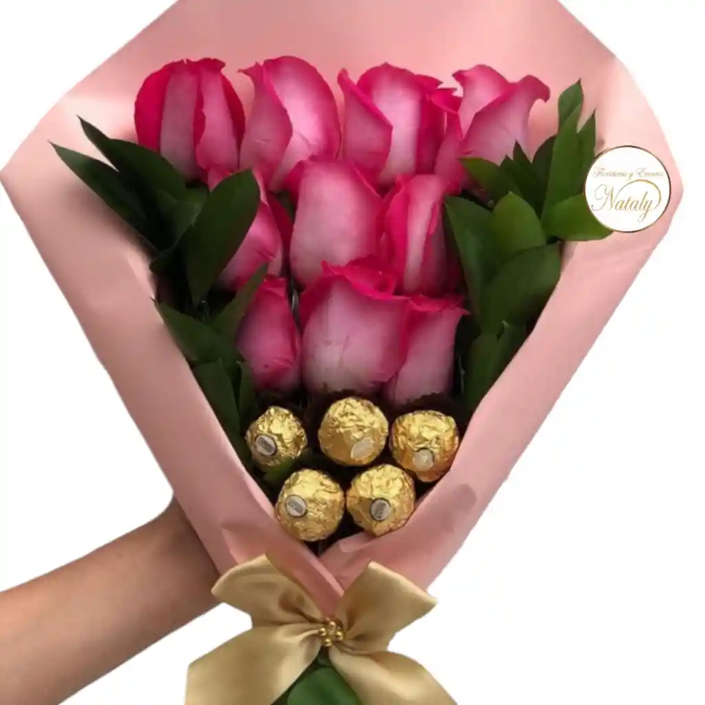 Elaborado con diez rosas fucsias que deslumbran con su intenso color y elegancia, se entrelazan seis chocolates Ferrero Rocher, con su envoltura dorada que brilla como pequeños destellos de felicidad.