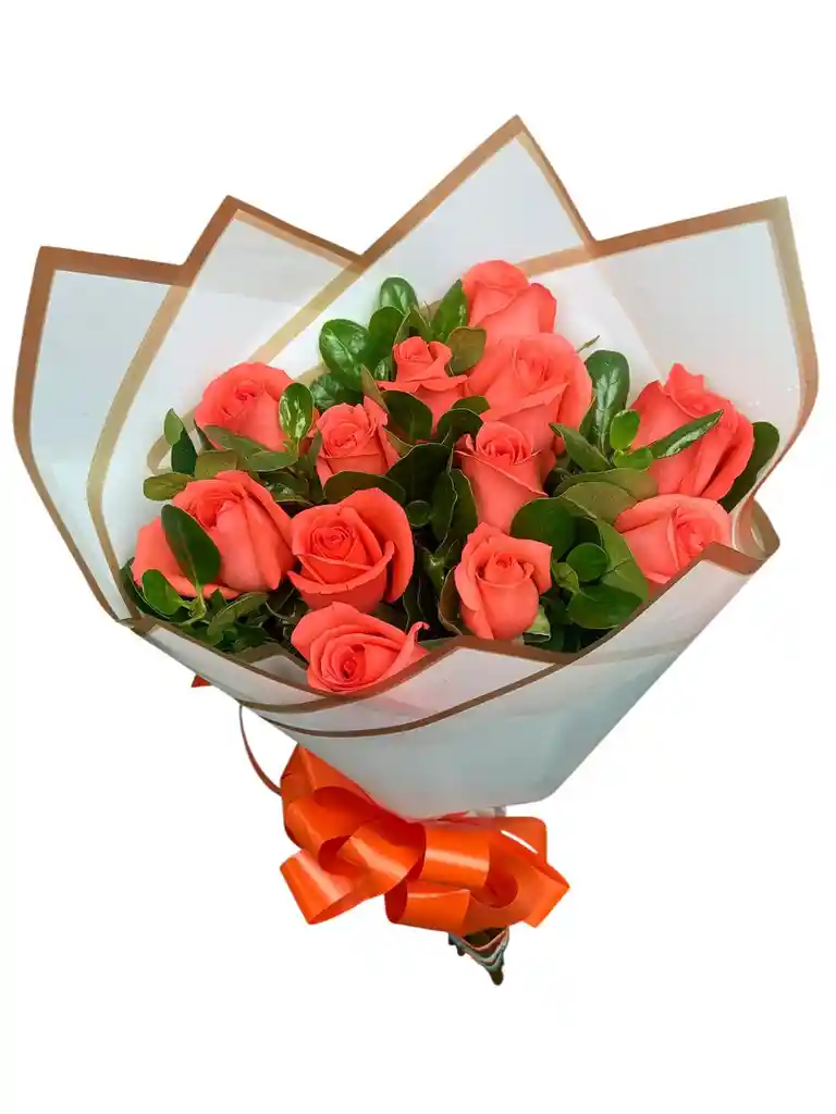 Arreglo floral x12 rosas tipo exportación en tonalidad naranja Follaje fino brillantina Papel coreano en tonos pastel Moño en satín color naranja
