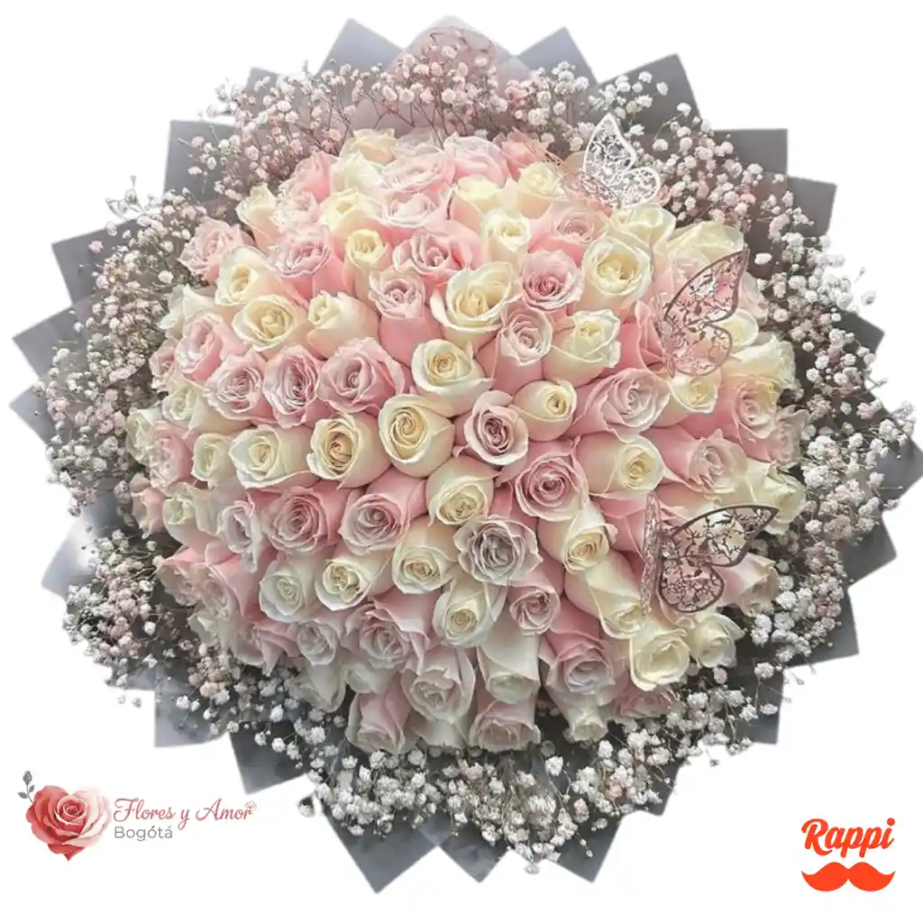 Un delicado y elegante bouquet compuesto por rosas en suaves tonos pastel que combinan rosado y blanco crema, creando una armonía romántica y sofisticada. Su diseño redondo y abundante resalta la belleza natural de cada rosa, cuidadosamente organizada para lograr un acabado compacto y de estilo premium. La composición está rodeada de finos detalles de gipsófila que aportan textura, frescura y un aire etéreo, mientras las mariposas decorativas añaden un toque mágico y especial que simboliza transformación, amor y nuevos comienzos. Envuelto en papel en tono gris que realza la suavidad de los colores, es el detalle perfecto para cumpleaños, aniversarios, celebraciones especiales o para expresar amor y ternura con elegancia. Un arreglo diseñado para enamorar a primera vista y dejar un recuerdo inolvidable.
