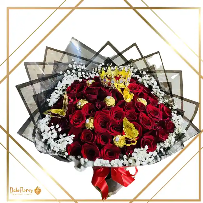 Bouquet de 60 rosas, 6 rosas con corona de princesa, finos follajes y tarjeta personalizada.