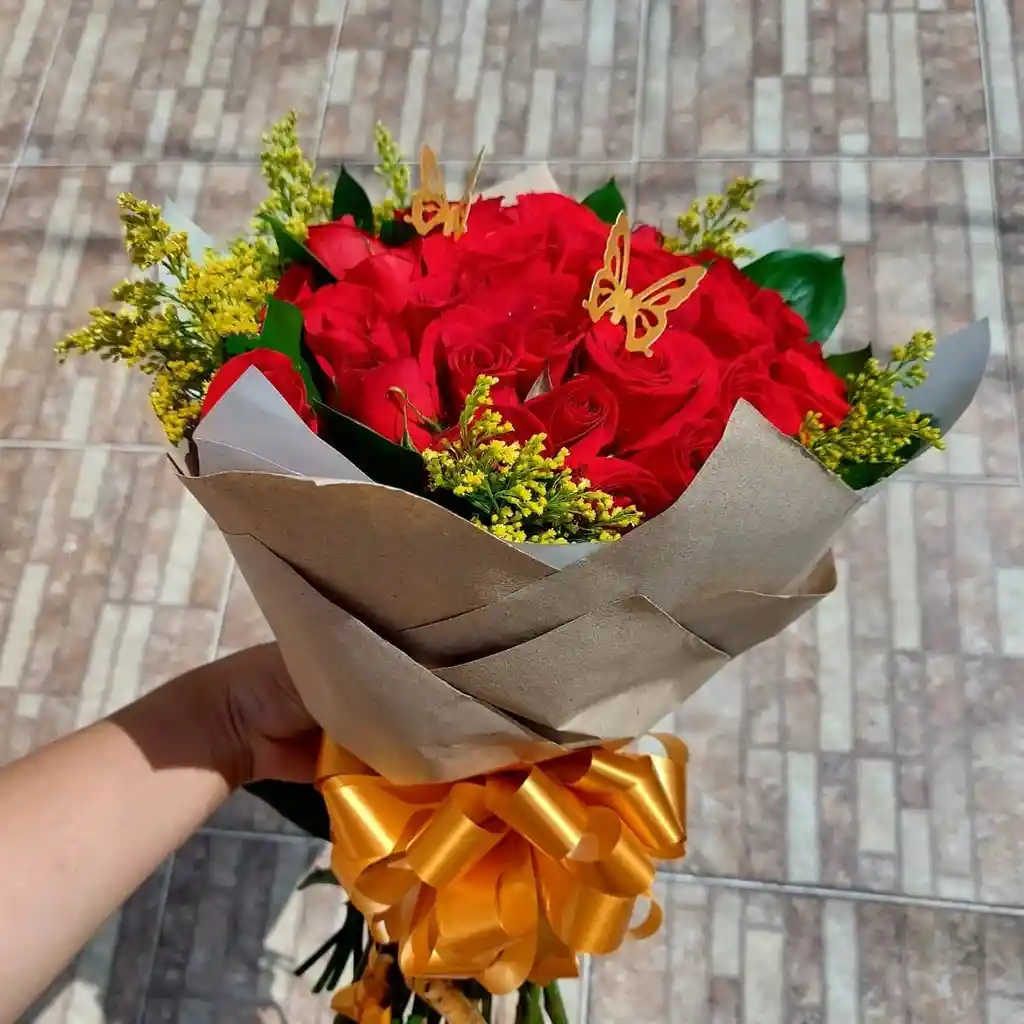 -bouquet con 24 unidades de rosas rojas -papel Kraft -1 mariposa -cinta de color de su preferencia -decoración -tarjeta