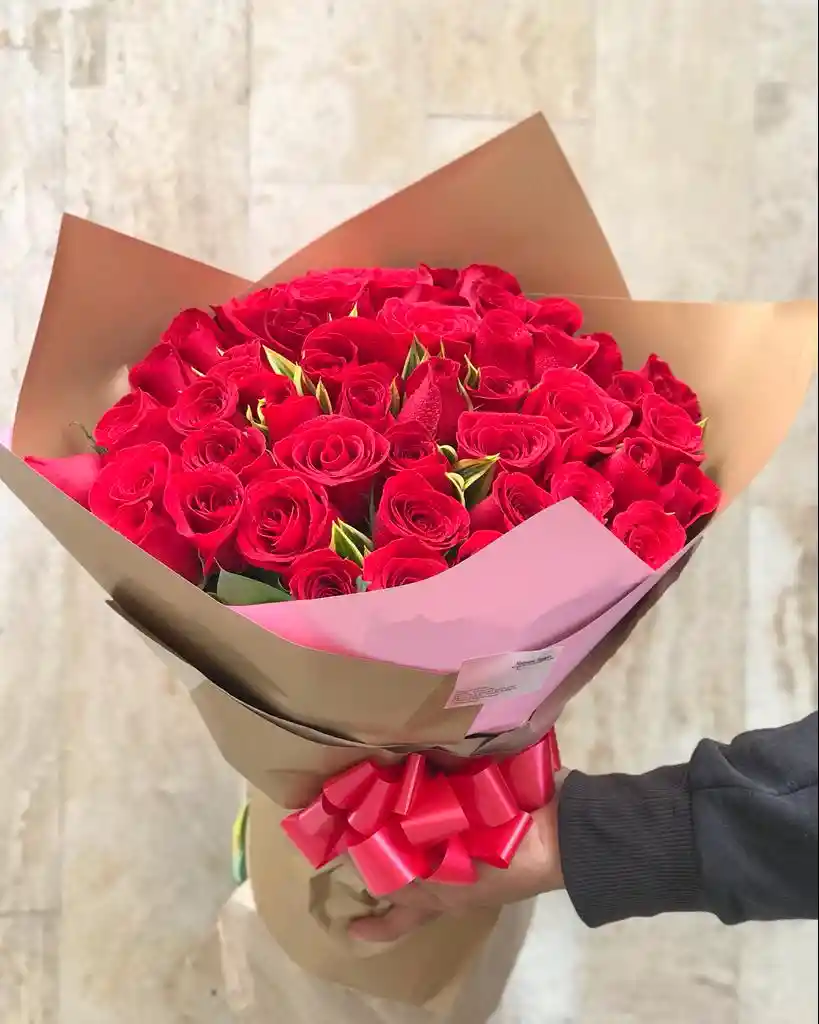bouquet 36 unidades de rosas rojas -cinta de color de su preferencia -decoración -tarjeta -papeles decorativos
