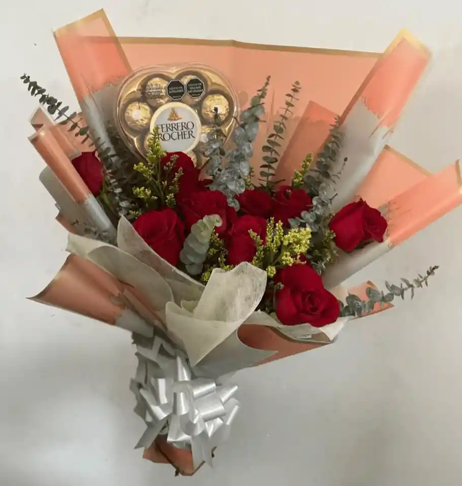 12 ROSAS ROJAS, CON EUCALIPTO, SOLIDAGO EN PAPEL COREANO Y FERRERO DE CORAZON