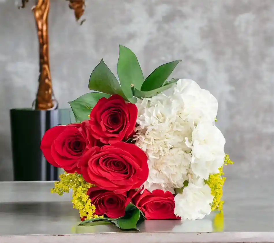 5 Rosas tipo exportación y 5 claveles, 30 cm de largo, incluye decoración y tarjeta (indicar en el chat que mensaje desea)