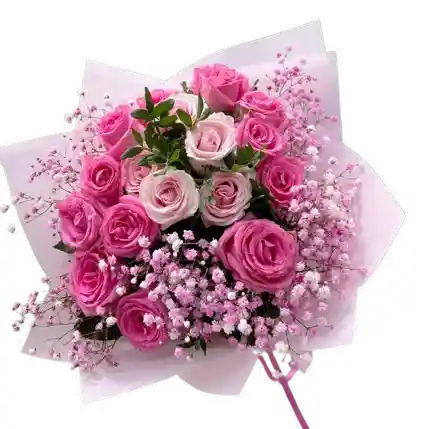 Un bouquet deslumbrante compuesto por rosas en tonos fucsia, rosa medio y rosa pastel, acompañado de abundante gypsophila rosada que aporta un toque etéreo y delicado. Su envoltura blanca de diseño moderno realza la frescura y vivacidad del arreglo, creando una presentación armoniosa y encantadora. Perfecto para aniversarios, cumpleaños, detalles románticos o para sorprender con un gesto lleno de dulzura y elegancia. Su mezcla de tonos rosados transmite cariño, ternura y alegría, convirtiéndolo en un regalo que ilumina cualquier ocasión.