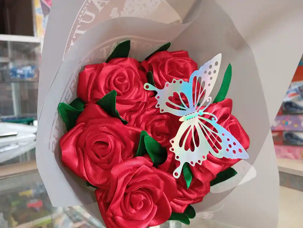 Paper.Click cuenta con el detalle perfecto para demostrar los mas lindos sentimientos por esos seres queridos. Rosa elaborada a mano en listón, satín con una envoltura en papel coreano, mariposa, escarcha, fragancia y tarjeta.