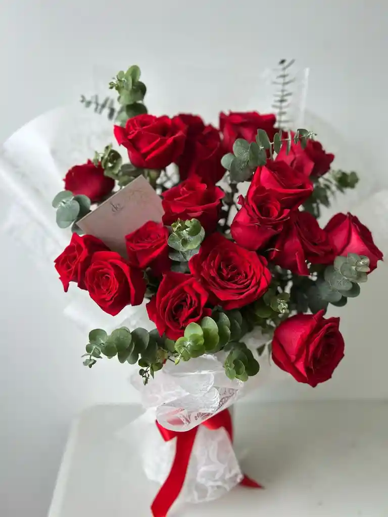 Bouquet en oasis con rosas y eucalipto