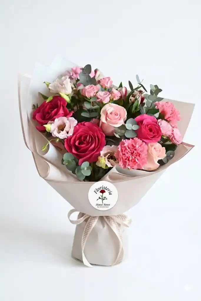 Un bouquet delicado y elegante que transmite amor, ternura y dulzura. Este hermoso arreglo combina rosas en tonos rosado y fucsia, acompañadas de claveles y flores delicadas, junto con finos detalles de follaje que resaltan su belleza natural. Envuelto en papel premium en tonos suaves y decorado con un elegante lazo, es el regalo perfecto para cumpleaños, aniversarios, agradecimientos o para sorprender a alguien especial.