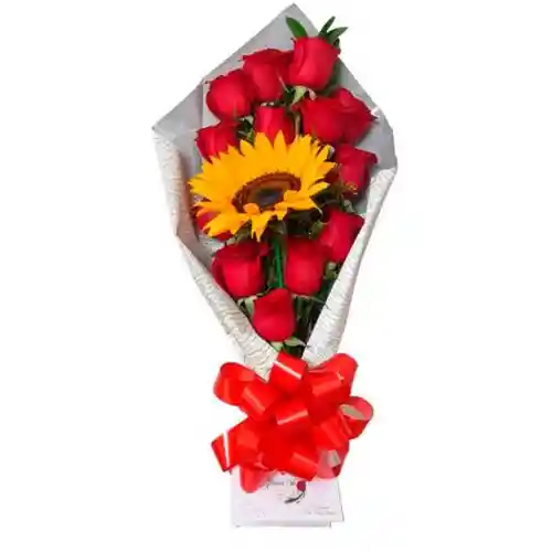 detalle en rosas follaje y girasol mas empaque