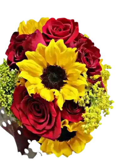 12 Rosas rojas tipo exportación y 5 girasoles, 30 cm de largo, incluye decoración y tarjeta (indicar en el chat que mensaje desea) de color Multicolor ideal para el Felicitaciones