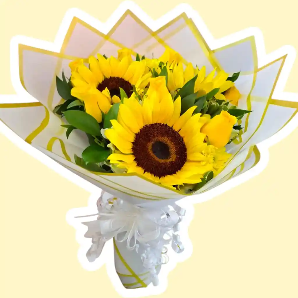 Un radiante bouquet de girasoles medianos 🌻 combinado con hermosas rosas 🌹 flores y follaje fresco, envuelto en elegante papel coreano detalles (diseño a disponibilidad de la tienda 🤍✨, ideal para transmitir alegría, luz y buenos deseos 💛; perfecto como regalo en cumpleaños, aniversarios o detalles sorpresa 🎁. Además, puedes personalizarlo eligiendo el color de las rosas: roja ❤️, amarilla 💛, fucsia 💖, rosada 🌸, lila 💜 o blanca 🤍, convirtiéndolo en una opción única de flores a domicilio que llena de energía positiva y estilo cada momento 🚚💐.