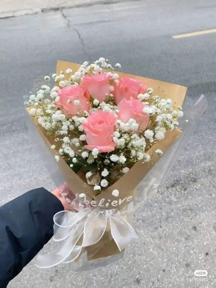 este boquet de 6 rosas es la esencia de la dulzura y el encanto. Este delicado buqué presenta un arreglo de rosas rosadas premium en un tono suave con gipso