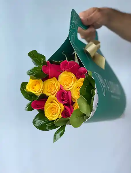 Bouquet de 12 tallos de rosa (colores de temporada) y follaje calidad exportación con exclusivo empaque.