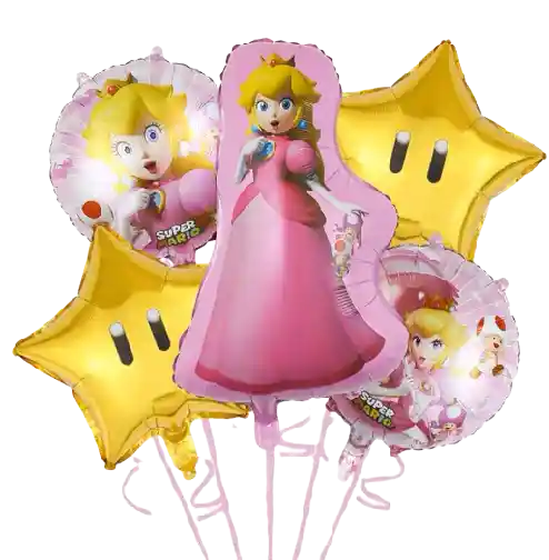 Bouquet Set Globos Princesa Peach Mario 5 Piezas. Los globos pueden ser inflados con Helio o Aire. Se envía herramienta para que el cliente puede inflar los globos con aire. *Imagen de Referencia, algunos colores e imagenes pueden variar* *Debido a políticas de Rappi, los globos son entregados sin inflar*