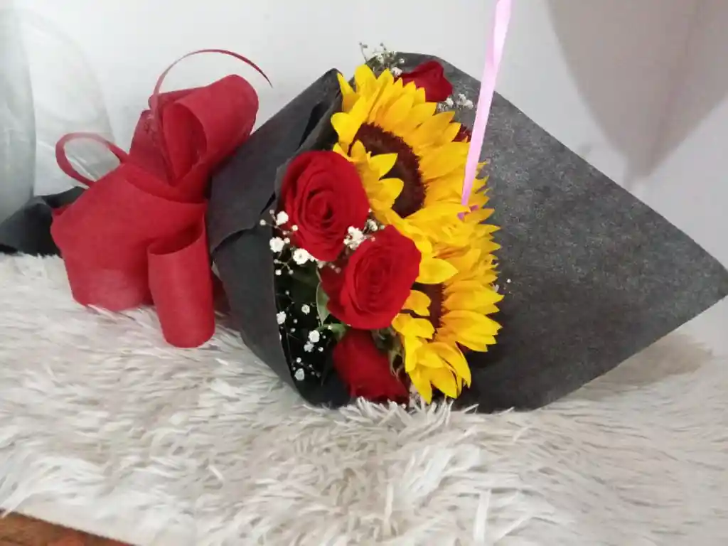 bouquet elaborado con 2 girasoles, gypsophilia y 10 rosas, en tela negra y lazo decorativo