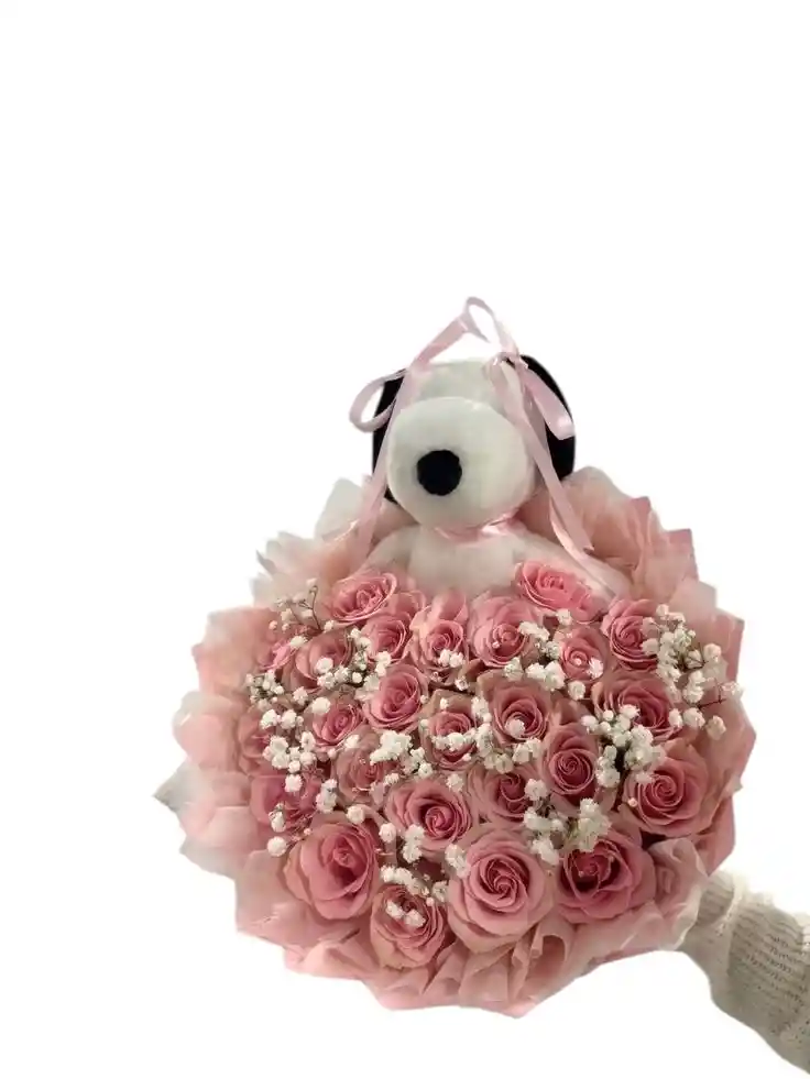 hermoso bouquet acompañado de rosas en color rosado pastel, gipsófila y peluche animado de Snoopy. Generando un hermoso detalle para tu enamorada