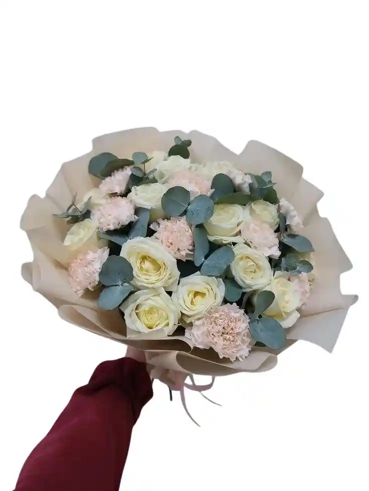Bouquet de 12 rosas blancas aprox. con 10 claveles rosados y eucalipto. Nota: La flor puede ser sustituida dependiendo la disponibilidad de color y del producto “Mensaje Personalizado” máximo de 30 caracteres (Dejar el mensaje en el chat, los comentarios no se previsualizan para la tienda por lo que si se dejan allí no podrá ser incluido).