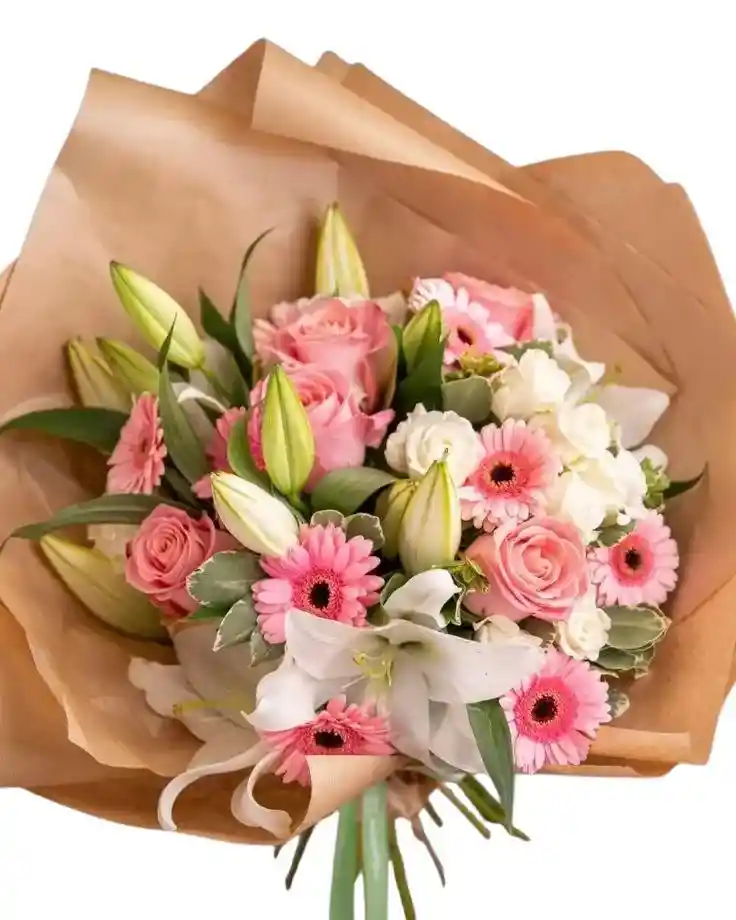 Bouquet con aprox. 4 varas de lirios blancos 6 rosas rosadas 6 rosas blancas y 9 gerberas rosadas . Nota: La flor puede ser sustituida dependiendo la disponibilidad de color y del producto “Mensaje Personalizado” máximo de 30 caracteres (Dejar el mensaje en el chat, los comentarios no se previsualizan para la tienda por lo que si se dejan allí no podrá ser incluido)